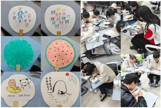 窗外寒意渐浓,室内却暖意融融。活动现场为同学们准备了四种空白扇面以及多彩的绘画笔具。伴着热饮与茶点的香甜,同学们暂时忘却学业的压力,沉浸在创作的乐趣中。大家围绕扇面精心构思,或绘制传统梅兰竹菊彰显雅趣,或勾勒卡通形象充满童真,或创作抽象图案表达个性,原本素净的扇子在笔尖的舞动下被赋予了独特的生命力与故事。