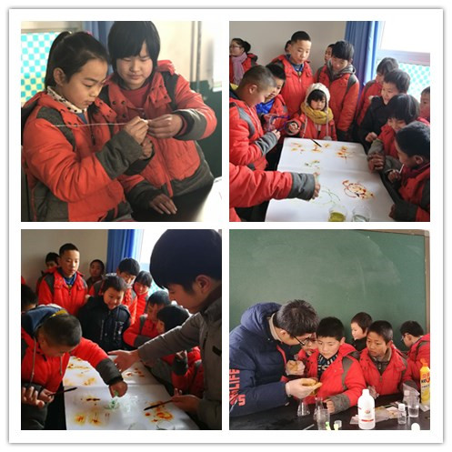 捐赠活动在师生们的掌声中结束,学院团委、科协同学便马不停蹄地开始了趣味课堂活动。本次趣味课堂主要是进行趣味化学实验,共设计了三项实验:大象牙膏实验、喷雾作画实验和红绿灯实验。院科协同学结合学院专业背景、将学院特色与学生兴趣相结合的趣味化学实验受到了学生们的热烈欢迎。烧杯中溶液的五彩变化引起学生们阵阵惊呼。同学们对本次的化学实验活动表现出了极大地兴趣和热情,表示要刻苦学习,争做科技人才。随后团委开启了工艺小车的制作教学活动,精美的手工小车让学生们们爱不释手,迫不及待地想要去制作一辆属于自己的小车。最后,孩子们把自己的作品高高举起,向大家展示自己的作品。在一片欢声笑语中,趣味扶志活动也渐入尾声。