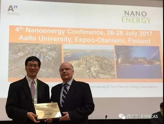 2017726日,在芬兰赫尔辛基举办的第四届纳米能源国际会议上,英国The NANOSMAT Societywww.nanoenergy.co.uk)学会会长Nasar Ali和大会主席 Peter Lund 教授代表纳米能源奖委员会将2017年度“全球纳米能源奖”(Global Nanoenergy Prize)授予王中林院士并颁发了奖牌和奖金以表彰他在纳米科技特别是纳米能源领域的领袖、原创和创新的杰出贡献。这个首界全球纳米能源奖是针对王教授在执教生涯中对纳米科技的重大贡献,特别是在纳米压电和纳米铁电材料领域总的突破和领导性贡献。该奖充分肯定王教授在纳米能源这一至关重要领域的卓越地位。(The annual GLOBAL NANOENERGY PRIZE recognises, substantiates and honors high calibre scientists for their professional leadership, originality and innovations in research and development relating to nanoscience and nanotechnology with a specific focus on NANOENERGY. The 2017 GLOBAL NANOENERGY PRIZE to you is for your outstanding contributions in the field of nanoscience and nanotechnology and for your professional career achievements, in particular for your breakthrough and inspirational research in the field of nano-piezo and nano-ferroelectric materials. This award recognizes your excellence and stature in the very important field of NANOENERGY. 在介绍中,Lund教授高度赞扬了王教授在推动纳米发电机的从原创基础研究到产业化技术应用中的杰出贡献。