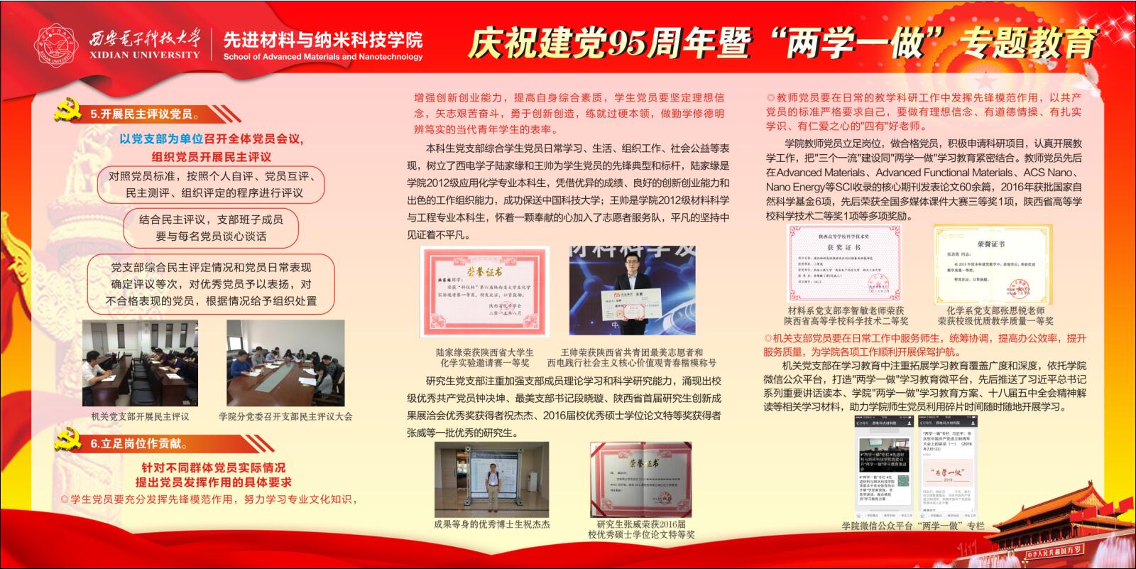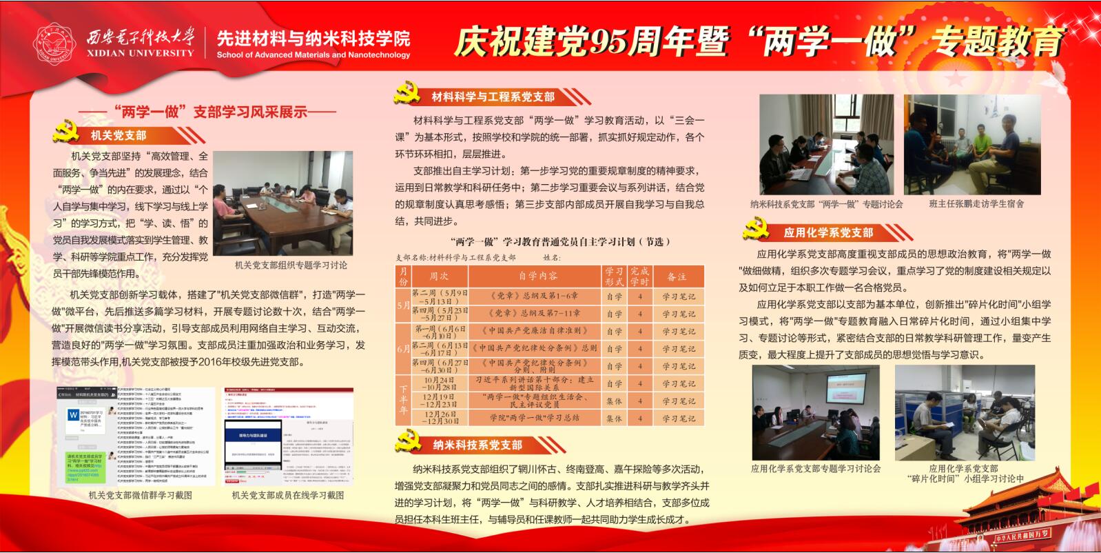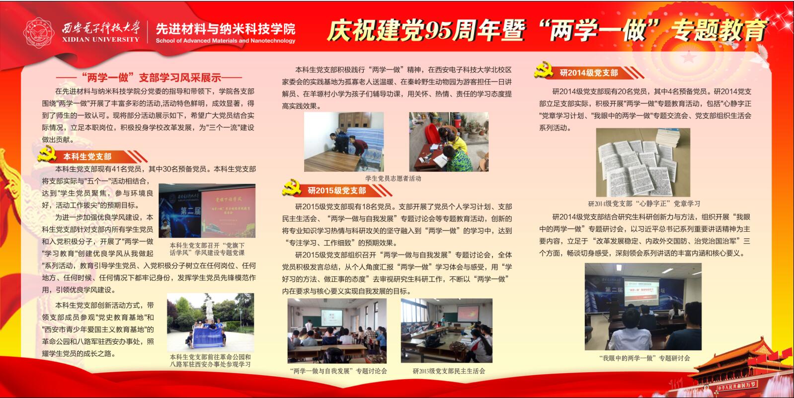 (通讯员 钟决坤 卢琳)为落实“两学一做”学习教育精神,充分发挥党员先锋模范作用,浓郁学院学习氛围,2016年9月,3044永利集团在G楼一层大厅学院文化展示区推出庆祝建党95周年暨“两学一做”教育专题展示。 3044永利集团积极开展“学党章党规、学系列讲话,做合格党员”学习教育活动,在学院分党委的指导和带领下,各支部以“两学一做”为中心开展了丰富多彩的学习教育活动,特色鲜明,成效显著。本次展示主要以展板的形式体现,紧紧围绕“两学一做”的核心教育内容、学院学习教育方案、各支部创意活动等内容,采用文字、图片和图表相结合的方式,全面、凝练且清晰的展示了“如何学、怎么做”,学院特色教育活动以及各支部将“两学一做”融入学习、教学、科研、管理等方面的风采。希望广大党员结合实际情况,立足本职岗位,积极投身学校改革发展,为“三个一流”建设做出贡献。(完)