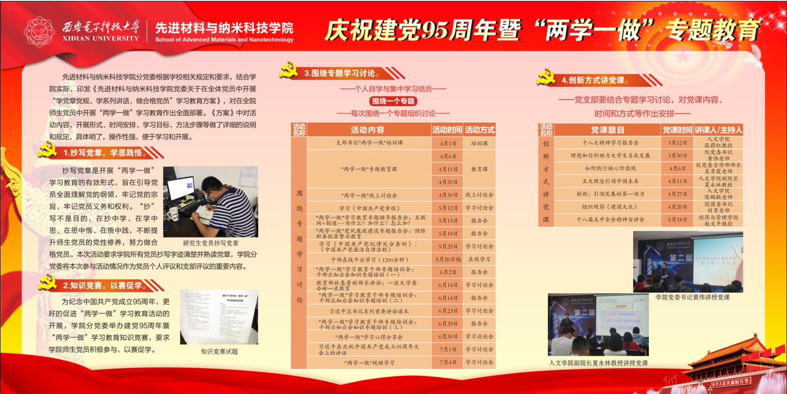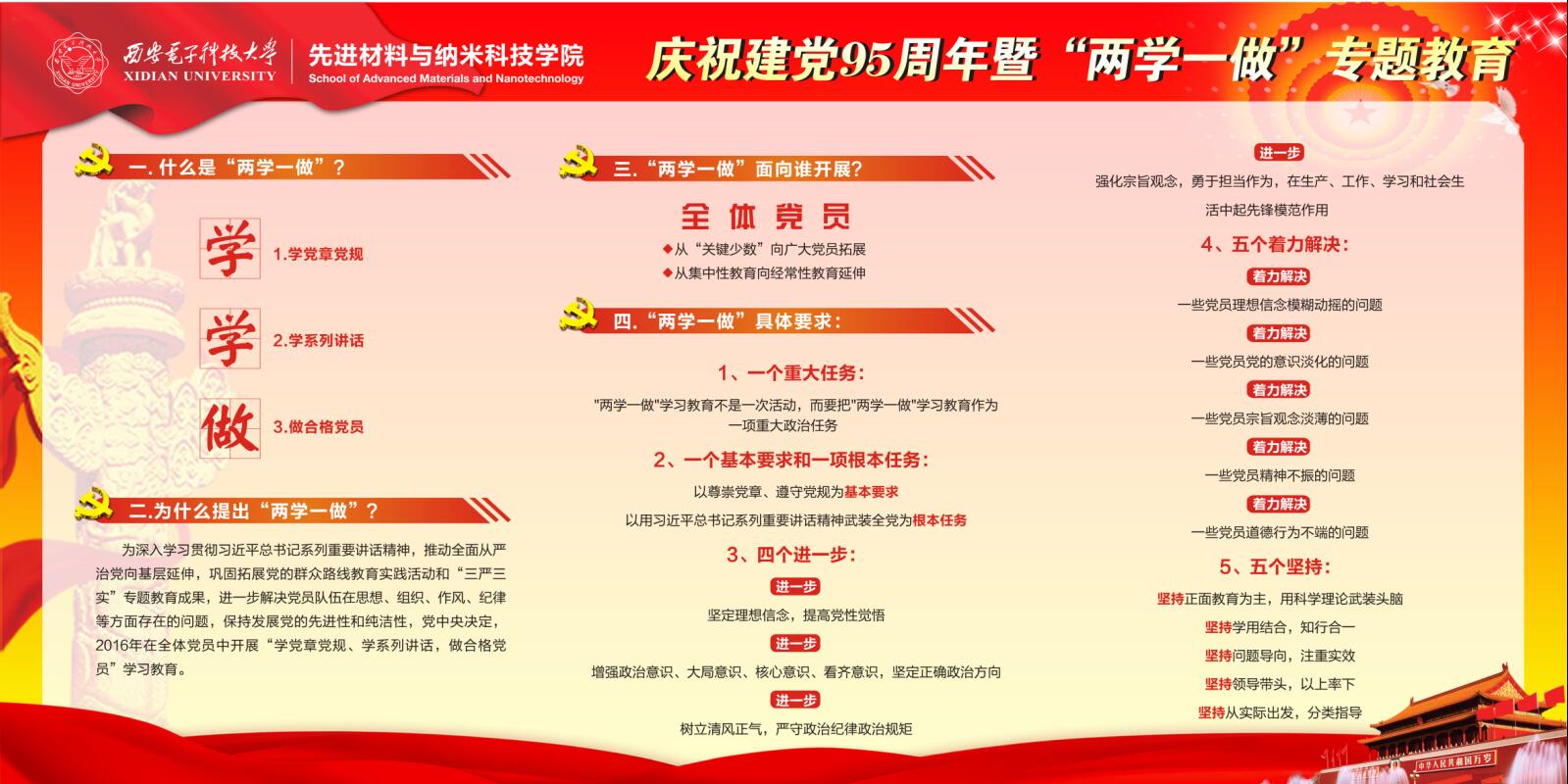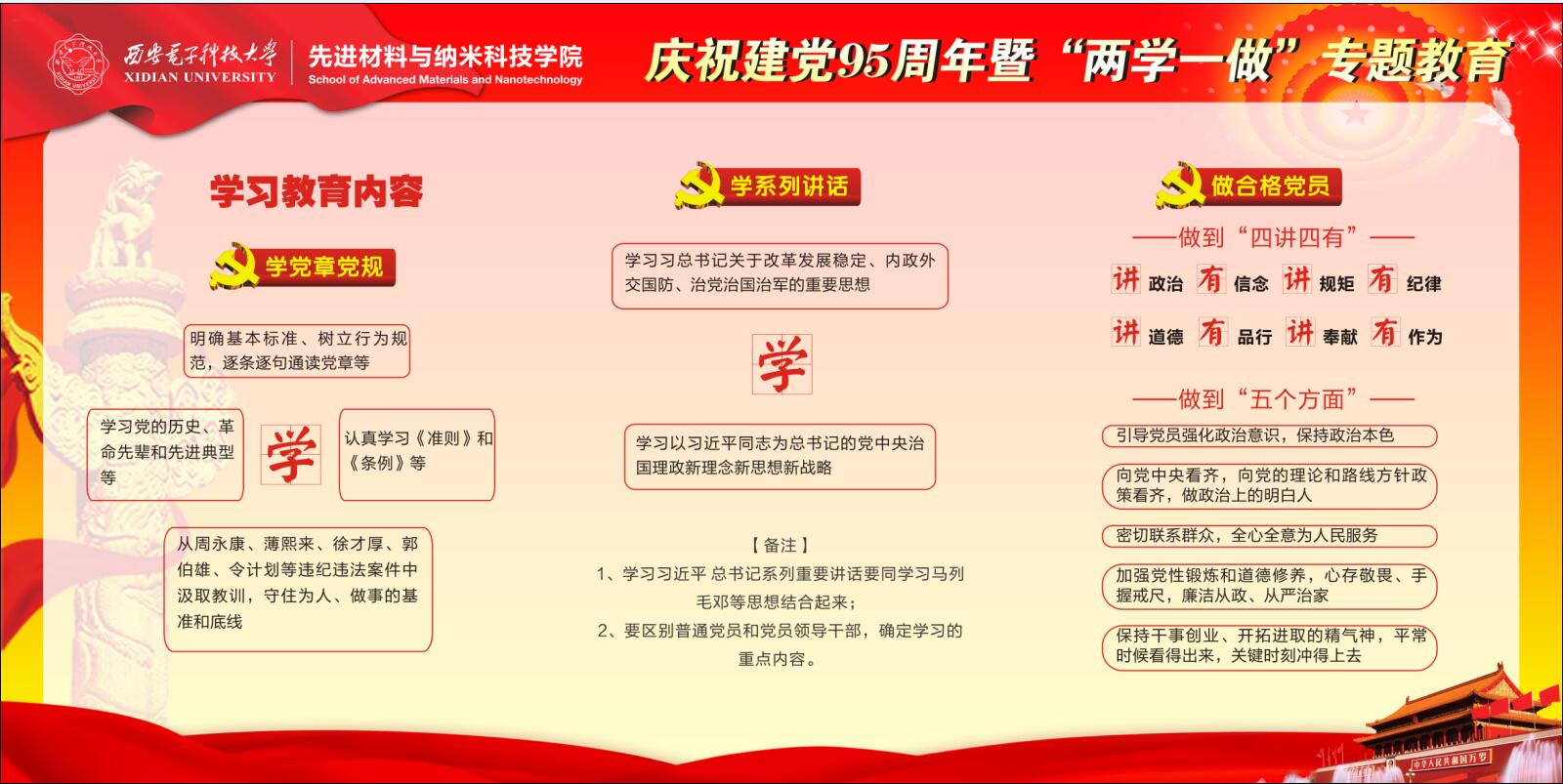 (通讯员 钟决坤 卢琳)为落实“两学一做”学习教育精神,充分发挥党员先锋模范作用,浓郁学院学习氛围,2016年9月,3044永利集团在G楼一层大厅学院文化展示区推出庆祝建党95周年暨“两学一做”教育专题展示。 3044永利集团积极开展“学党章党规、学系列讲话,做合格党员”学习教育活动,在学院分党委的指导和带领下,各支部以“两学一做”为中心开展了丰富多彩的学习教育活动,特色鲜明,成效显著。本次展示主要以展板的形式体现,紧紧围绕“两学一做”的核心教育内容、学院学习教育方案、各支部创意活动等内容,采用文字、图片和图表相结合的方式,全面、凝练且清晰的展示了“如何学、怎么做”,学院特色教育活动以及各支部将“两学一做”融入学习、教学、科研、管理等方面的风采。希望广大党员结合实际情况,立足本职岗位,积极投身学校改革发展,为“三个一流”建设做出贡献。(完)