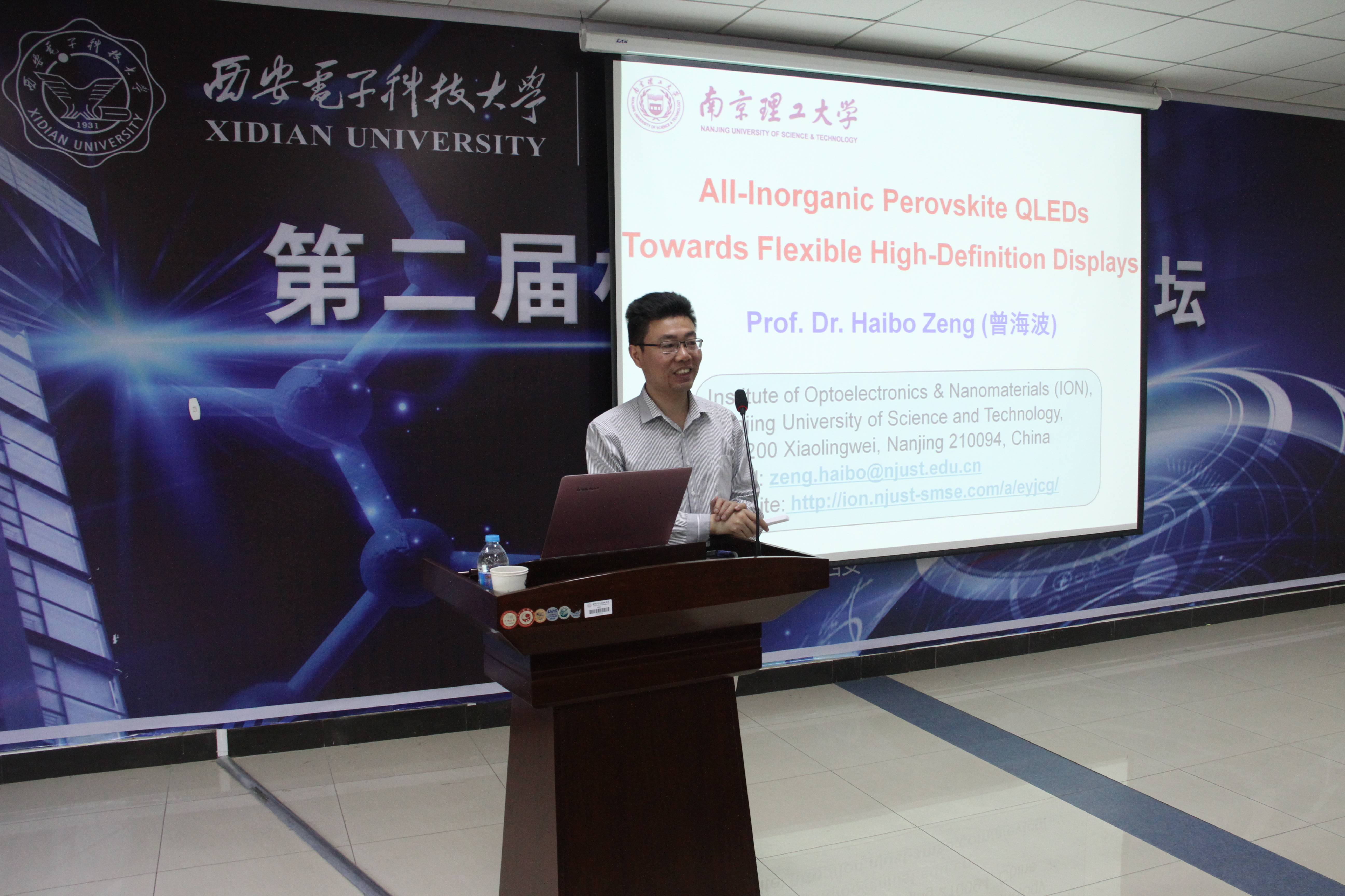 曾海波教授此次报告题目为“面向柔性高清显示的新型发光半导体与发光器件”。首先,曾教授深入浅出地介绍了显示器的发展历程,从材料结构到工艺制造,结合最近国际前沿的创新发现做了全面详尽的说明。他指出目前照片与显示领域正在迎来品质升级与柔性,在液晶显示和柔性现实需求两方面有着广阔的开发潜力。随后,曾海波教授风趣的详细介绍了柔性高清显示的新型发光半导体与发光器件的研究过程以及南理工纳米光电材料研究所具体情况。他提到科技进步唯有转化为生产力,才能体现出其价值。他所在的课题组在研究过程中,从设计、合成、器件和系统四个步骤逐层完成研究,在国际上首创了全无机钙钛矿全彩发光二极管,被《自然-纳米科技》等专题评委“首次”、“打破了镉系量子点显示壁垒” ,现已成为新型显示材料与器件领域的国际前沿热点方向。