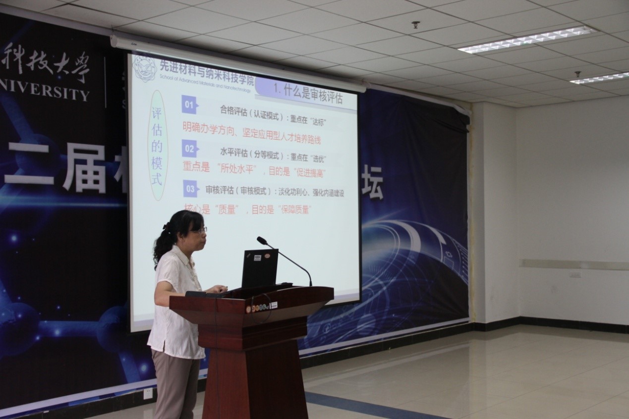 梁燕萍为参会人员做审核评估解读与培训报告,主要从审核评估的模式、目的、指导思想、原则、范围及评估程序与时间安排等方面进行了详细解读。她谈到,本科教学审核评估是由评估机构组成的,对参评普通高等学校本科教学质量管理体系的适宜性、充分性和有效性,进行审查与评价的过程,其目的是规范学校整体的教学运行,建立起整体的教育教学质量保障体系,形成常态化的运行机制,有效地保证人才培养的质量和特色。审核评估以“一坚持二突出三强化”为指导思想,坚持主体性、目标性、多样性、发展性和实证性五项基本原则,以对学院人才培养目标与培养效果的实现状况进行评价为评估核心。在介绍评估程序及时间安排时,梁燕萍强调全院要通过认真组织学习和研讨,深刻领会审核评估6+1个审核项目、24个要素、64个观测点的内涵和要求,提升教育教学理念,规范教学秩序和管理,并做好数据填报、支撑材料整理、自评报告撰写等相关工作。结合本科教学审核评估具体要求,学院也对2016年深化教育教学改革计划方案进行了再次调整。