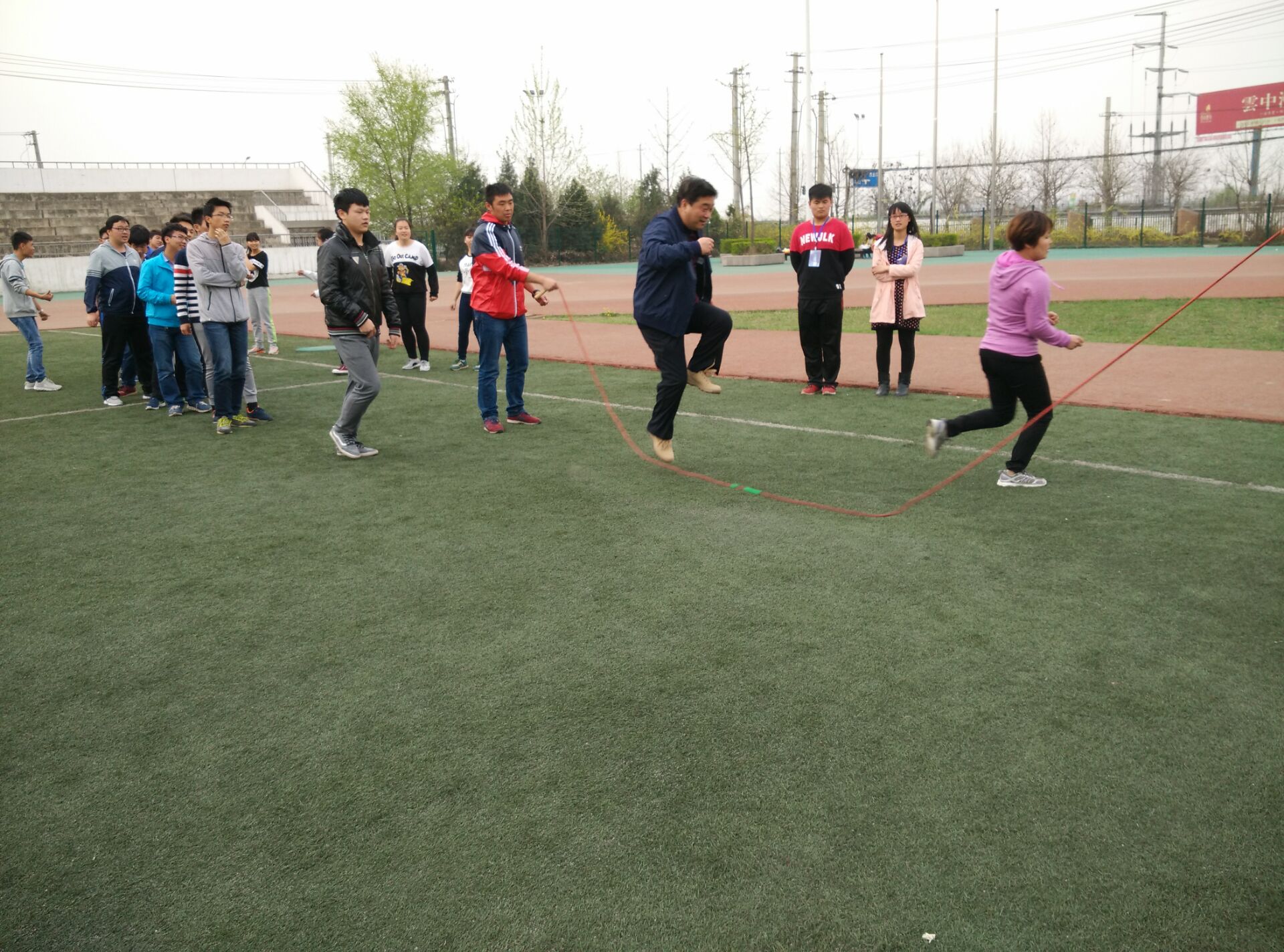 首先进行的是跳大绳比赛,绳子被同学们抡得呼呼生风,打得地面啪啪直响,同学们穿梭其间,精神抖擞,身轻如燕,动作敏捷。