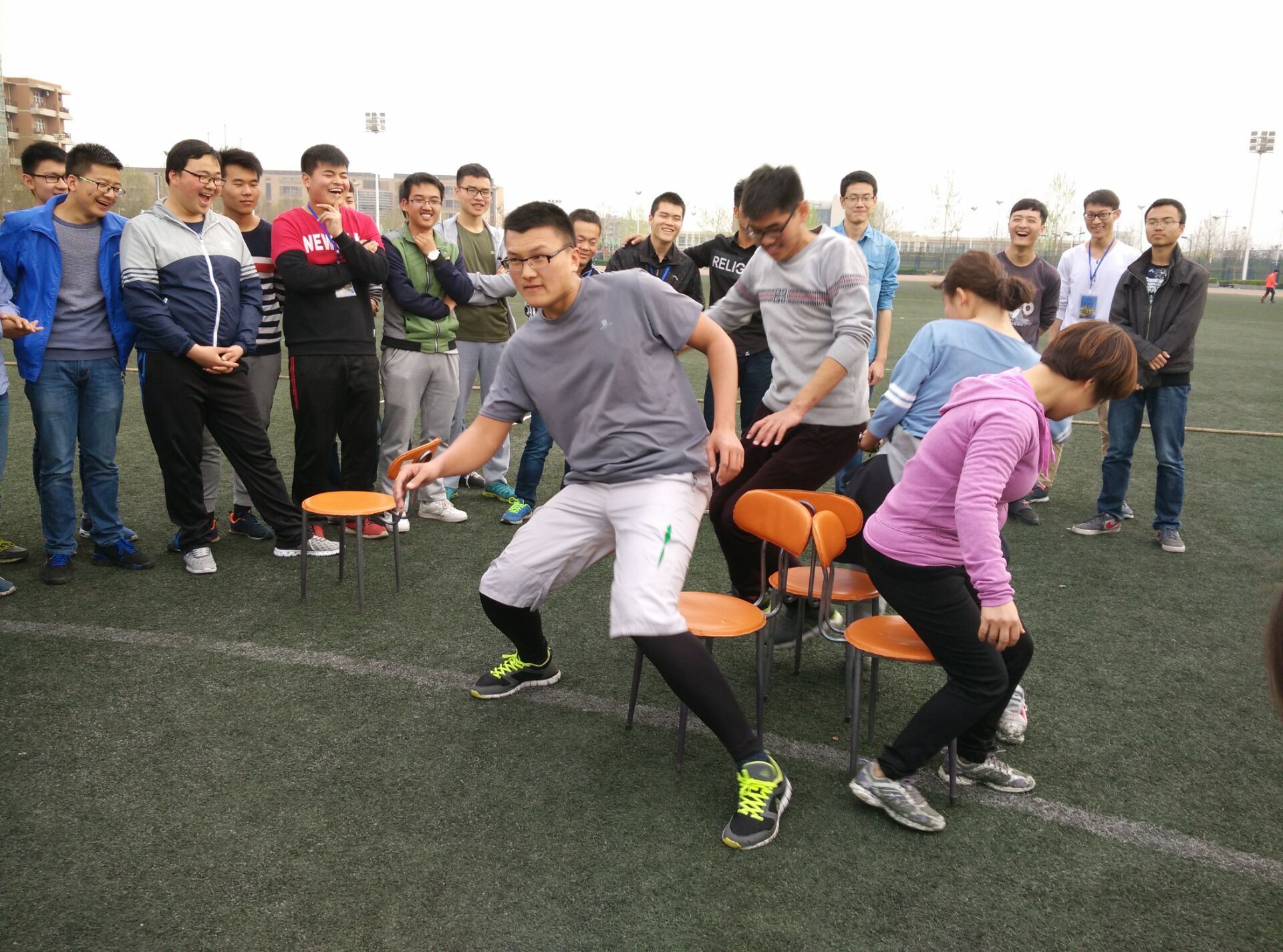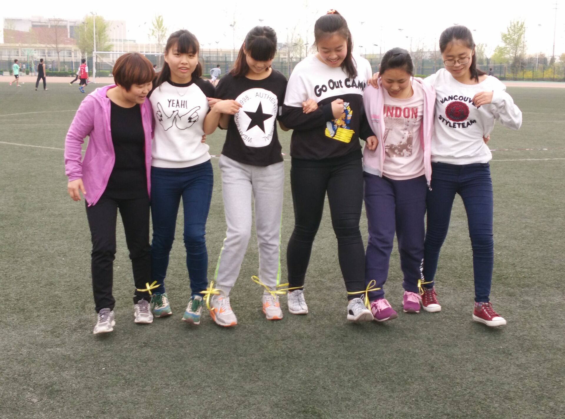 六人七足游戏中,大家在整齐的口号中配合默契,拉拉队员更是不甘示弱,加油声此起彼伏。