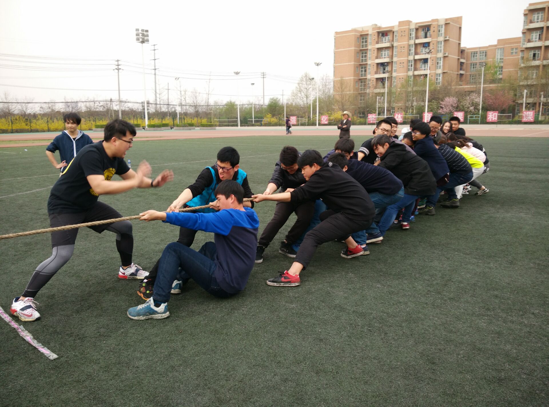 作为趣味运动会的最后一个项目,拔河可是将大家最后的余力也用光了,每个人都是鼓足了劲,面红耳赤,咬紧了牙,用力抓紧大麻绳使劲往后拉 。
