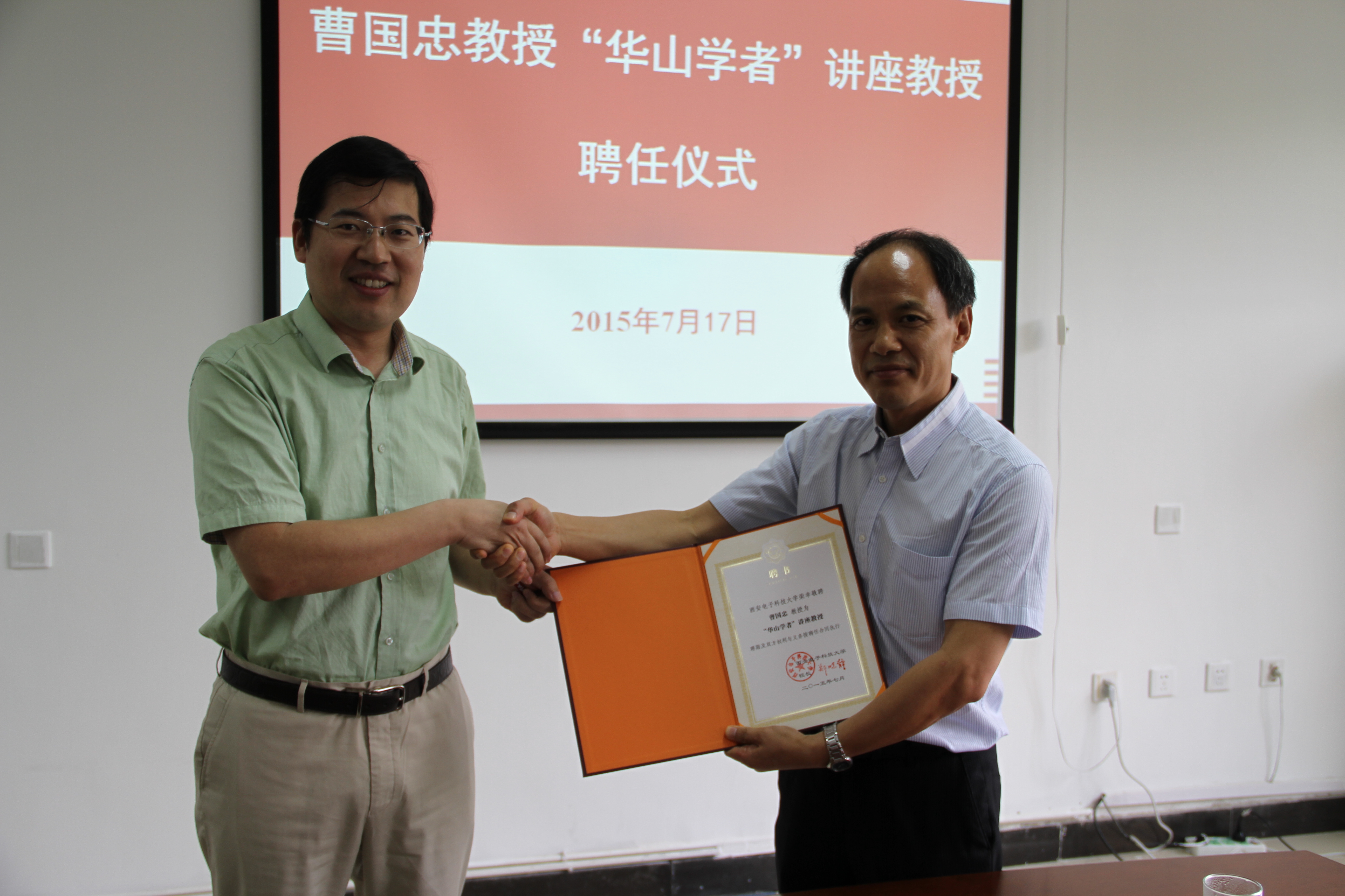 学院执行院长史小卫首先介绍了曹国忠教授的个人简历与学术业绩。随后,高新波为曹国忠颁发聘任证书并致辞。