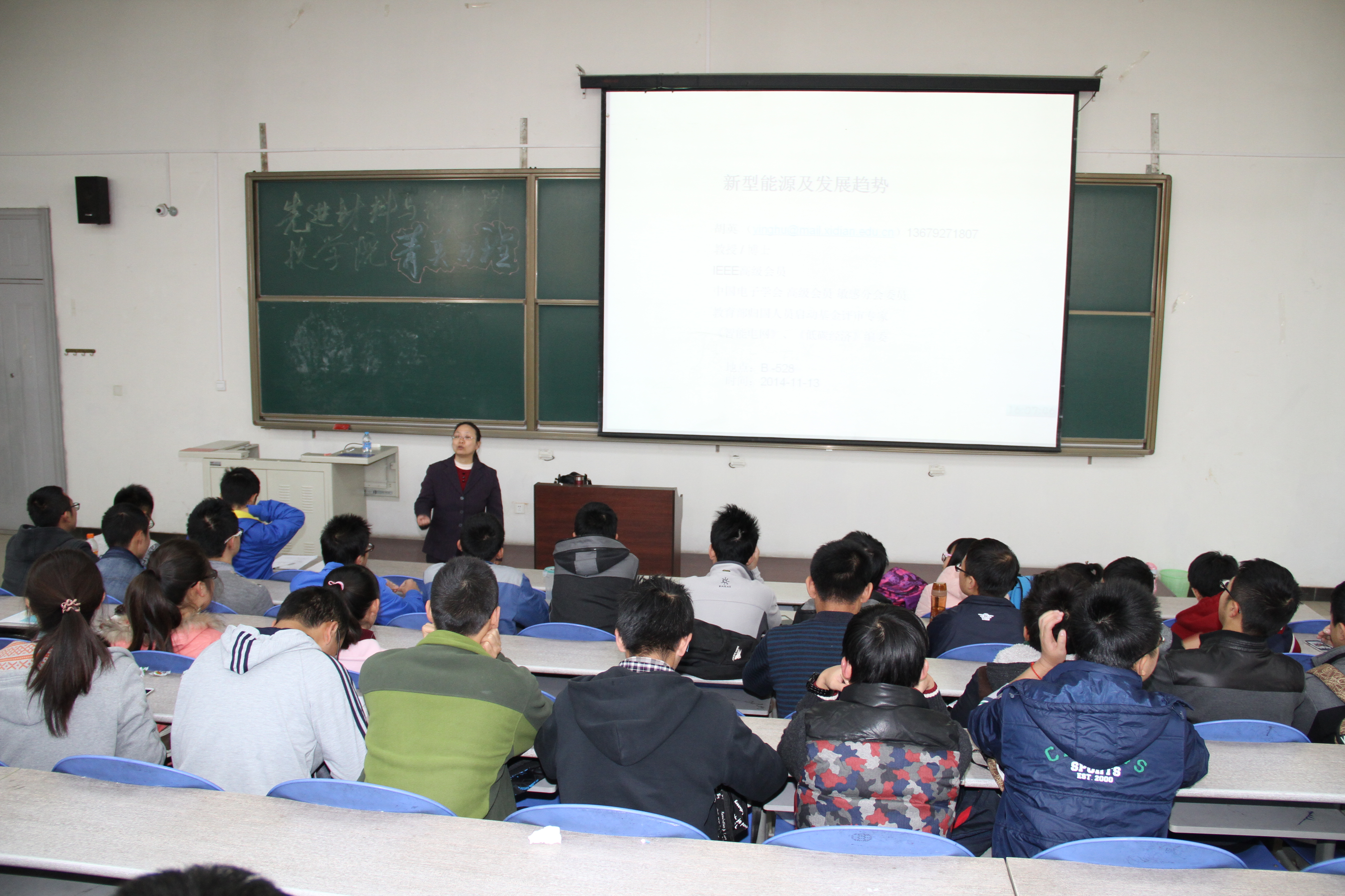 本次讲座主题是“新能源及发展趋势”,由学院胡英教授主讲。首先,她形象生动地向大家介绍了当今世界面临的能源问题。接着,从全光谱光催化材料、太阳能电池、超级电容器、车用氧传感器四个主题展开,通过最新的科研进展,多方向、多角度介绍材料在能源领域中的应用。最后,她鼓励低年级学生认真学习基础课,在熟悉专业的同时为专业课的学习打下基础,并支持高年级同学进入实验室接触科研项目,在完成项目的过程中更加了解所学专业、不断提升自己的科研水平。
