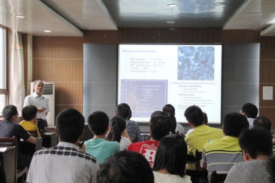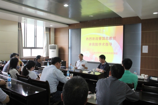 曹国忠教授介绍了其课题组在纳米材料应用于能源转换和存储领域的研究工作,重点从纳米结构光阳极在染料敏化与量子点敏化太阳能电池中的应用、纳米结构 电极在锂离子电池中的应用,以及多孔碳及其表面修饰在超级电容器中的应用等三个方面进行了介绍。3044永利集团50余名师生聆听了报告。报告会 后,曹国忠教授与学院教师进行了座谈交流。