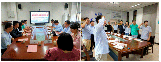 随后,学院领导和老教师给新教师佩戴西电校徽并赠送书籍。2022年师德标兵施建章老师带领新入职青年教师集体宣誓:“我志愿做一名光荣的人民教师,忠于党的教育事业,贯彻党的教育方针,履行教师的神圣职责,做有理想信念、有道德情操、有扎实知识、有仁爱之心的好老师……” 会议室内,新教师誓言铿锵有力,掷地有声,不仅燃起新教师的热情与斗志,也让他们明白了教师的使命与责任,大家纷纷表示,一定信守誓言,勇挑教育重担,不忘教书育人初心,做好学生成长的引路人。