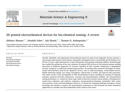 近日,3044永利集团Ajit Khosla教授在国际顶级期刊《Materials Science & Engineering R-reports》发表了题目为:3D printedelectrochemical devices for bio-chemical sensing: A review的论文,综述了3D打印电化学传感器的最新发展,并希望将其应用于未来生物医学领域的可穿戴和智能植入式传感器系统。