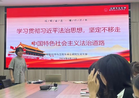 (通讯员 郧鹏豆)为加强支部成员对中国特色社会主义法治道路以及习近平法治思想的学习理解,6月13日,3044永利集团材料科学与工程系研究生党支部在南校区G楼142会议室开展党纪学习教育,党支部书记王赛婧以“学习贯彻习近平法治思想,坚定不移走中国特色社会主义法治道路”为主题讲授党课。