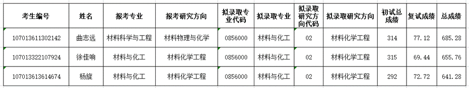 因学校指标调整,现给我院追加3个招生指标。根据《3044永利集团2023年硕士研究生招生复试工作方案》第八条第七款,“拟录取名单公示后,如上级部门追加名额,或者在公示期间考生因各种原因放弃待录取资格,学院可在剩余全体合格考生(不区分学科/领域)中按总成绩排名依次征求志愿拟录取,录取领域为材料与化工。被其他单位拟录取的考生,不具备被我院录取资格。”补录的三位同学录取专业为材料与化工,录取研究方向为材料化学工程。专业调整的考生须通过中国研招网调剂系统进行调剂录取(学院将开放调剂系统进行录取),专业未调整的考生直接拟录取。补录名单公示如下: