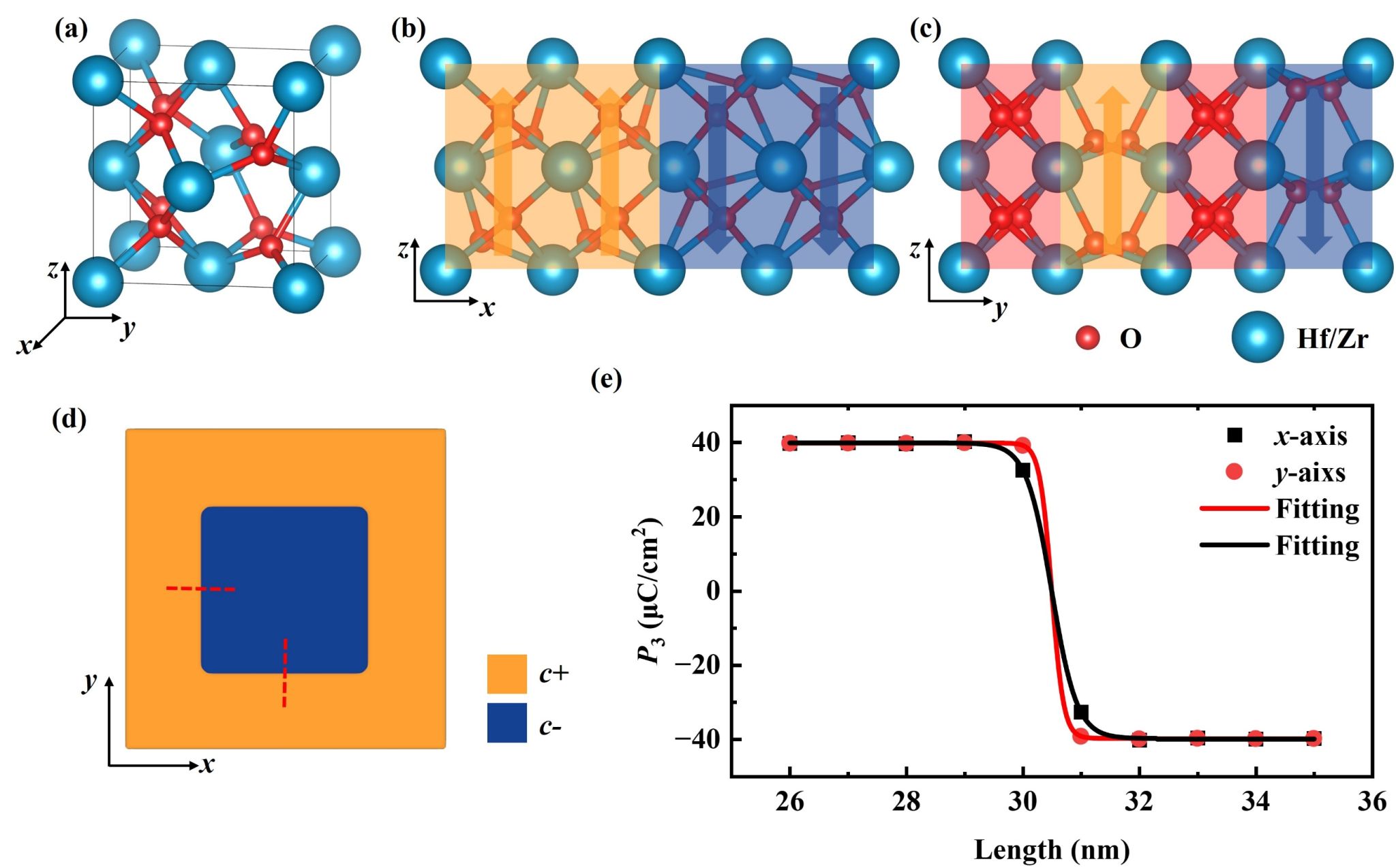 图1. HZO薄膜各向异性180°畴壁的原子结构示意图以及相场模拟得到的极化强度在畴壁处的分布。