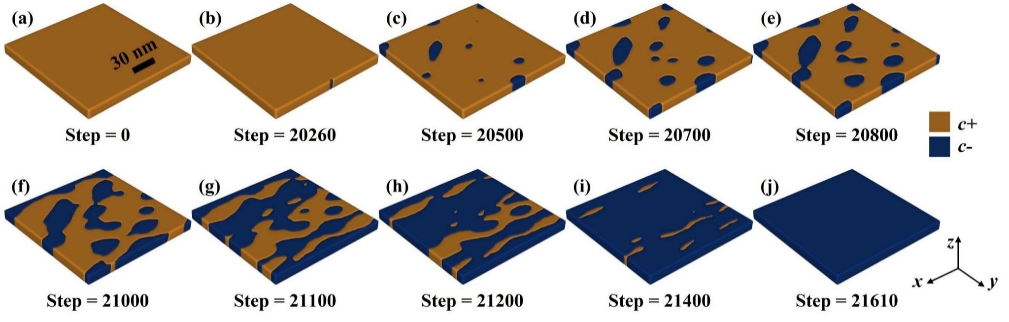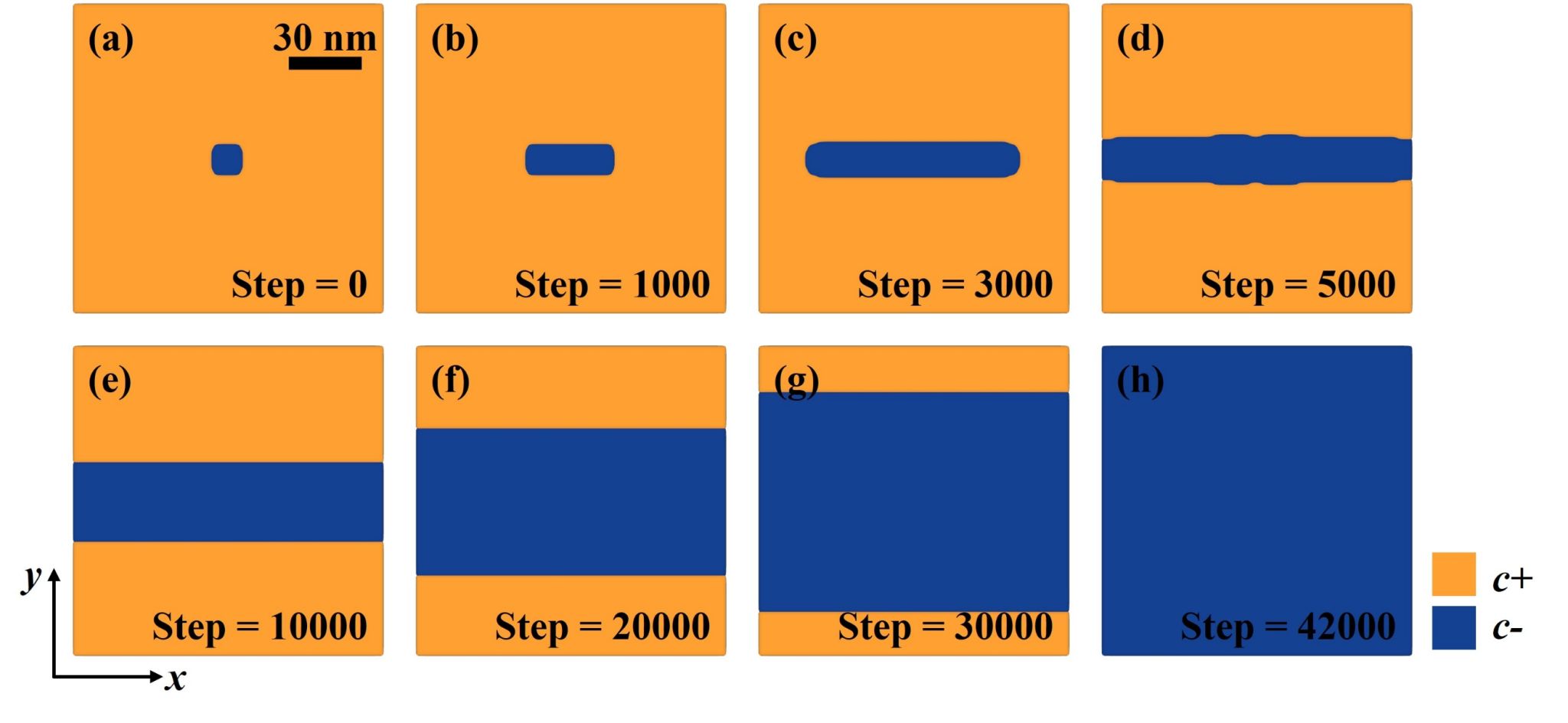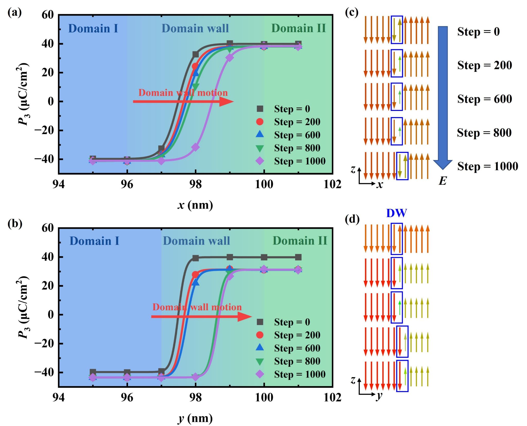 研究团队进一步通过相场模拟揭示了各向异性畴壁对180°畴翻转的影响。通过对比“软畴壁”与“硬畴壁”迁移所需的演化时间步数,结果表明:在电场驱动下,“软畴壁”沿x方向的迁移速度比“硬畴壁”沿y方向快约一个数量级(图2),导致极化翻转呈现明显的方向依赖性;反向成核的畴区优先沿x轴扩展形成条带状畴结构,随后硬畴壁才开始迁移,共同完成整个翻转过程。该发现明确了不同畴壁动力学特性对极化翻转速度的关键影响,为设计高性能铁电存储器提供了重要指导。