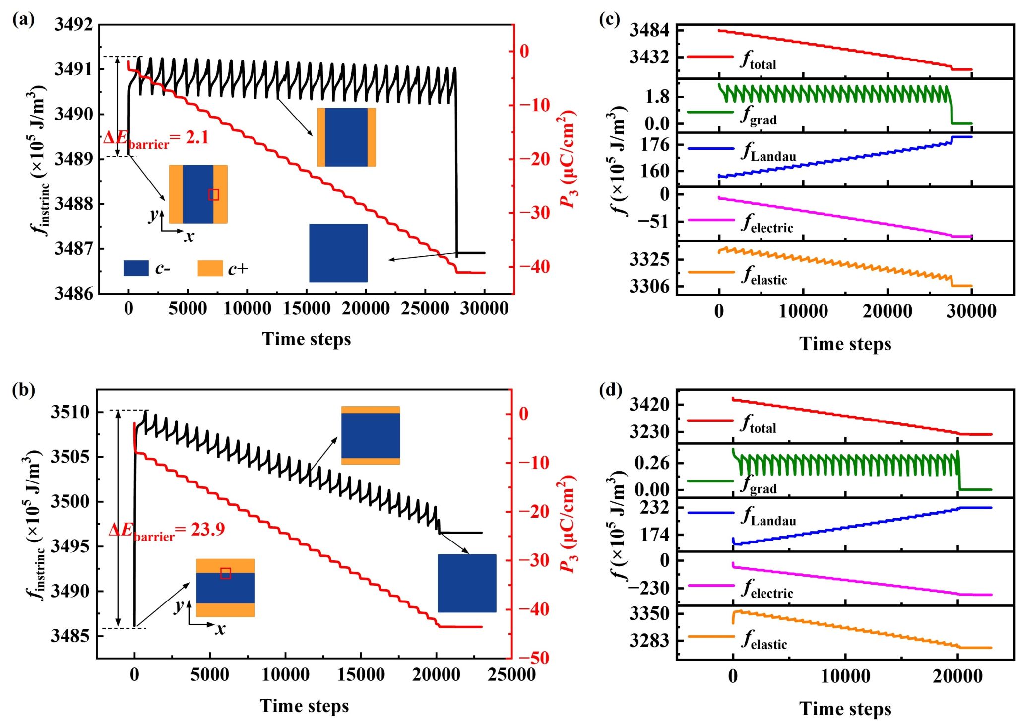 为揭示各向异性畴壁的迁移机制,研究团队通过相场模拟定量分析了不同方向畴壁的迁移能垒,如图3所示。结果表明,软畴壁的迁移能垒(2.1×105 J/m3)远低于硬畴壁(2.39×106 J/m3),两者相差近10倍,与第一性原理计算趋势一致。这一能垒差异解释了软畴壁迁移速度更快、所需临界电场更低的现象。