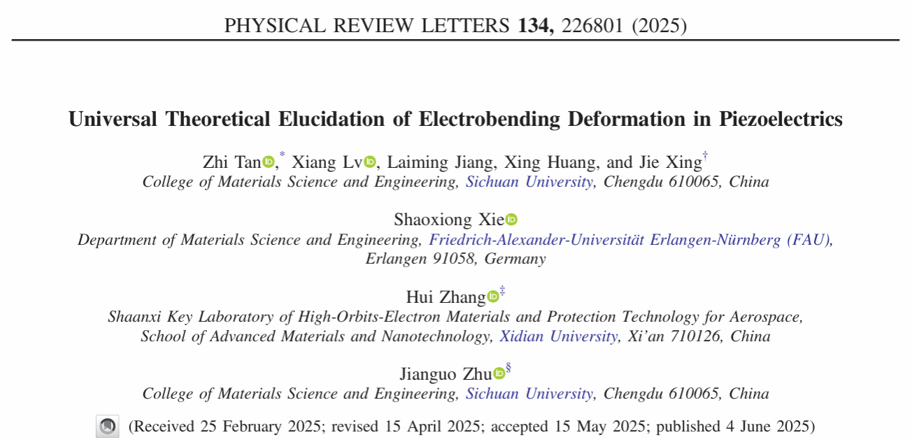 此前不久,张辉老师和四川大学谭智副研究员,邢洁副研究员,朱建国教授合作在美国物理学会旗舰期刊《Physical Review Letters》上(影响因子为9.0),以“Universal theoretical elucidation of electrobending deformation in piezoelectrics”为题发表了最新研究论文。