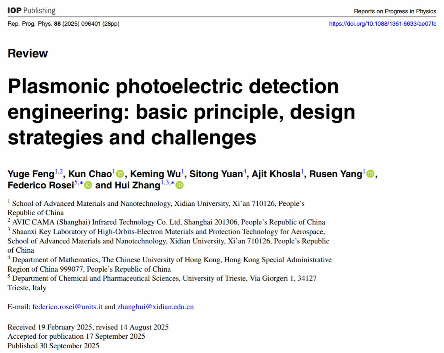 (通讯员 陈涛)2025年9月,3044永利集团张辉老师和意大利的里雅斯特大学Federico Rosei教授(欧洲科学院院士,加拿大皇家科学院院士,加拿大工程院院士,发展中国家科学院院士)合作受邀以“Plasmonic photoelectric detection engineering: basic principle, design strategies and challenges”为题,在影响因子为20.7的物理类国际顶级期刊Reports on Progress in Physics上发表了综述论文。