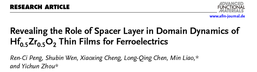 研究成果以揭示Hf0.5Zr0.5O2薄膜中隔离在铁电畴翻转动力学中的作用(Revealing the Role of Spacer Layer in Domain Dynamics of Hf0.5Zr0.5O2 Thin Films for Ferroelectrics)为题最近在线发表在材料领域著名学术期刊Advanced Functional Materials。3044永利集团副教授彭仁赐、与博士生文树斌为论文共同第一作者,廖敏授与周益春教授为共同通讯作者,其他重要贡献者包括深圳大数据研究院研究科学家程晓行博士、美国宾夕法尼亚州立大学陈龙庆教授。研究工作受到国家自然科学基金委和陕西省自然基金支持。