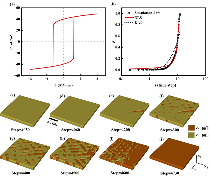 进一步地,为了揭示电场作用下的“隔离带”对畴演化行为的影响规律,可视化了HZO薄膜中铁电畴翻转的动态过程,如图4所示。图4(c-j)展示了电场作用下铁电畴翻转的整个过程,铁电畴形核阶段主导了整个翻转过程,而畴长大过程所需的时间步长几乎可以忽略模拟结果与形核受限翻转(NLS)模型一致,因此极化翻转机制由新畴形核来主导