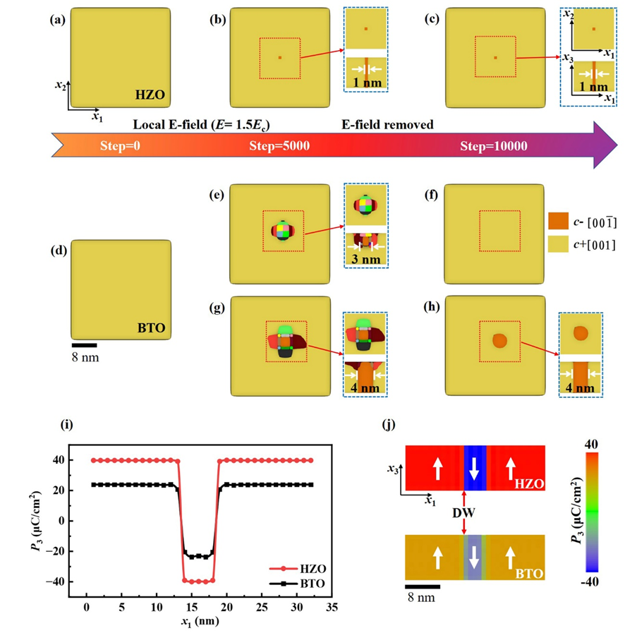 为了从介观尺度揭示“隔离带”结构对畴演化的影响,对比了HZO铁电薄膜和BaTiO3(BTO)铁电薄膜的畴翻转以及畴壁特性。图3(a-c)展示了施加和撤去方形局域电场后HZO铁电畴的演化行为,结果表明:面内尺寸为1 nm的反向畴能够独立翻转并在撤去电场后仍能稳定存在,表明HZO中相邻铁电畴之间的相互作用可以忽略,这种相互作用能通过梯度能系数来量化,这揭示了隔离带在铁电畴动力学中的介观机制。而BTO铁电畴稳定存在的面内临界尺寸为4 nm3 nm及以下尺寸的铁电畴不能贯穿薄膜并稳定存在,现出较强的畴间相互作用(图3(d-h))。图3(i-j)表明,HZO具有尖锐的畴壁而BTO的畴壁为扩散型,这也反映了两者间畴翻转行为的显著差异。