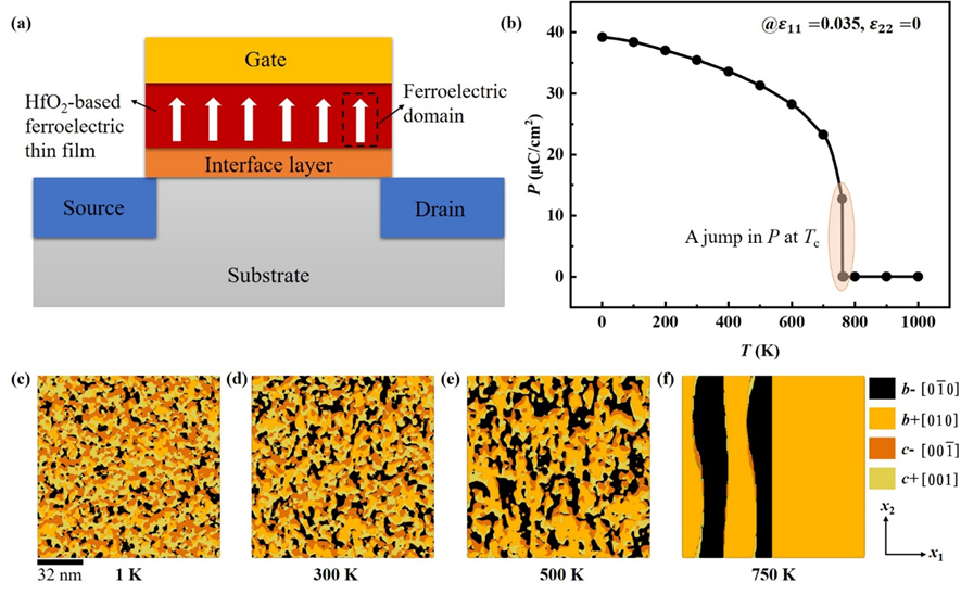 2. Hf0.5Zr0.5O2(HZO)薄膜中,相场模拟得到的极化强度随温度变化曲线在不同温度HZO薄膜铁电畴结构