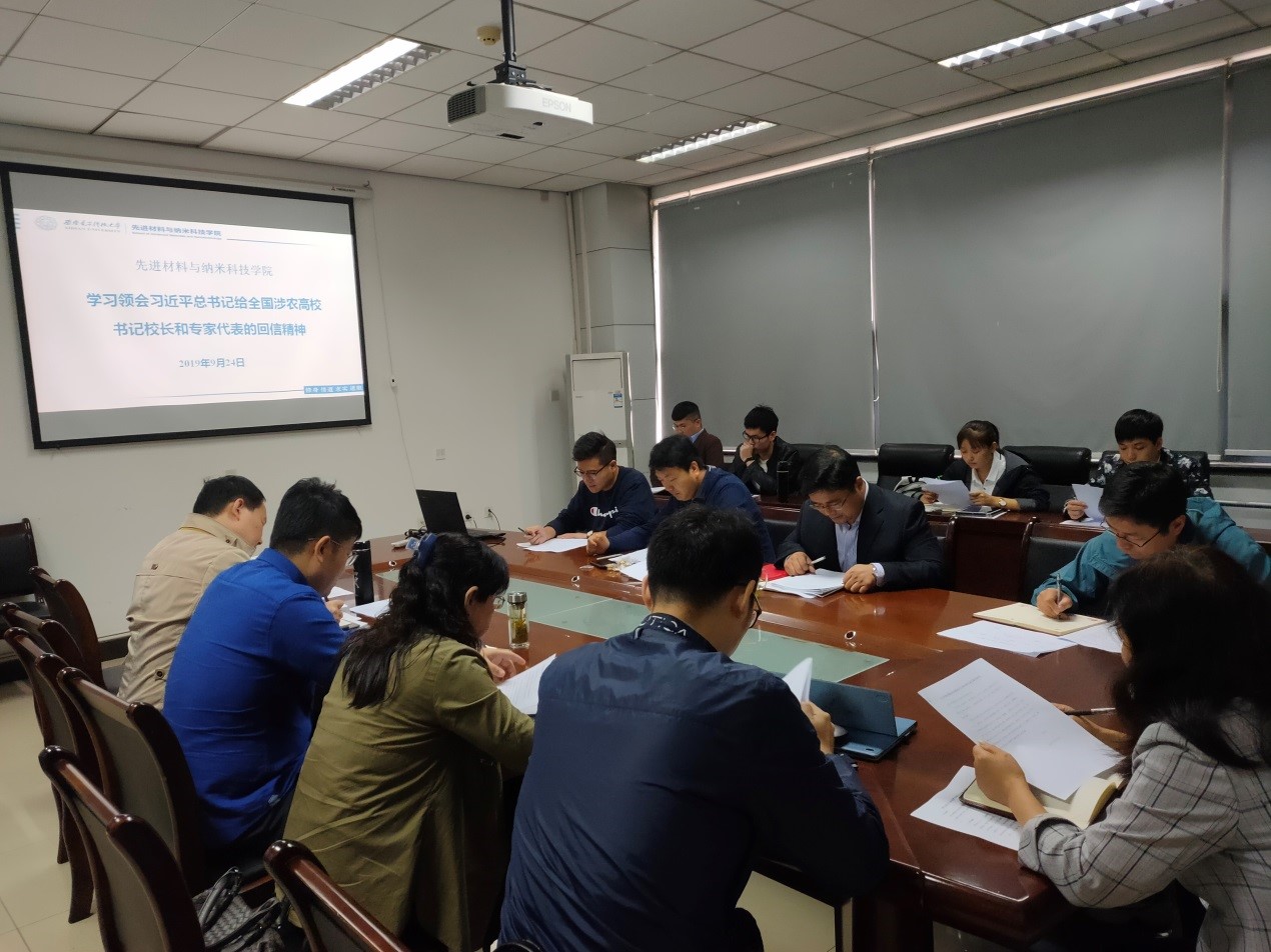 最后,卢硕同志带领大家集体学习《关于学习贯彻习近平总书记给全国涉农高校书记校长和专家代表重要回信精神的通知》。他表示,总书记的回信是新时代对涉农高校提出的具体要求,也是对高等教育工作提出的新要求;作为在高校工作的党员,也要把握住初心和使命,要把学习回信精神与“不忘初心、牢记使命”主题教育紧密结合,进一步强化使命和担当,推动学院全面发展。