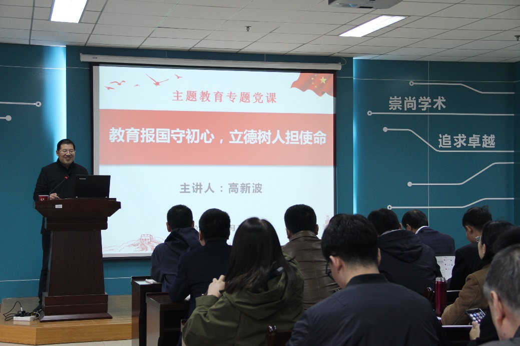 党课伊始,高新波从教育的起源入手,追根溯源,结合中外文明中对教育的解读,探讨了教育的初心和使命。以甲骨文时代“教”与“育”的本意为引;他讲到,“教”是普遍价值的共性,是由外到内的外部力量;“育”是灵性各异的个体,是由内到外的内生动力;好比学院与书院的关系,只有把“教”和“育”有机结合,才能真正发挥教育的作用,做好教育事业。引经据典,梳理总结,高新波分享到,教育的初心重在引导和激发、发展理性,而不是灌输知识、讲授道理等。教育的使命是努力让每一个人富有爱心,心地善良,灵魂高贵、干净,对多样的世界秉持宽容与尊重。