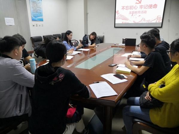 党支部书记王悦介绍了学院党委关于“不忘初心、牢记使命”主题教育的实施方案以及如何开展“我和我的祖国”党日活动。全体党员一起学习了习近平“不忘初心、牢记使命”主题教育工作会议上的重要讲话等内容。各党员发表观点并积极讨论交流,大家纷纷表示作为学生党员,也要把自己的“初心”和国家的“使命”相结合,铭记历史,高扬马克思主义旗帜不动摇,时时刻刻把“初心”和“使命”装在心中。把自己的命运和党的命运紧密联系在一起,敢于担当作为,为国家社会发展贡献力量。