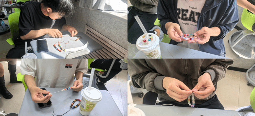 活动现场准备了多种色彩的琉璃珠饰、木质珠饰、金属配件及编织绳,搭配醇香奶茶,为参与者营造了轻松愉悦的创作环境。同学们或伏案构思设计,或互相探讨配色方案,将不同材质与形状的珠饰巧妙组合。有人以渐变珠串编织出手链,有人用纯色珠排列出几何韵律美,还有人在基础款式中加入小巧思,打造出简约而不简单的日常配饰。