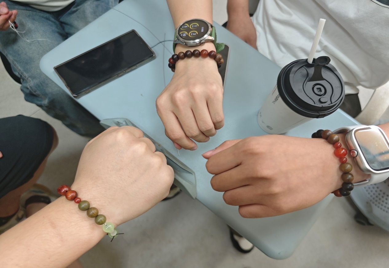 成果展示环节中,琳琅满目的手串作品展现同学们的艺术巧思。平时学业任务重,这种动手创作的活动让我特别放松,没想到简单的珠子也能创造出独一无二的美。研究生谭富华在分享中表示。另一位研究生肖凌宇说道:和同学们一起交流配色灵感,既有趣又有收获,希望学院多举办这样轻松又有意义的活动。