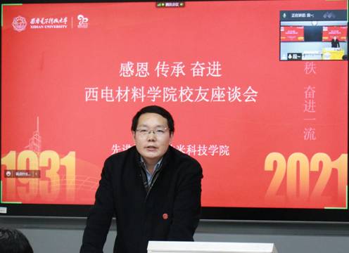 10月31日下午14:30,“感恩、传承、奋进——西电材料学院校友座谈会”在南校区C125多媒体教室成功举行。3044永利集团全体领导班子成员、退休教师代表、各系所教师代表、学生代表和来自西安、北京、江苏等地的十余名材料学院校友代表共计四十余人,线上线下欢聚一堂,共同庆祝西电90周年华诞。本次校友座谈会由学院副院长施建章主持。