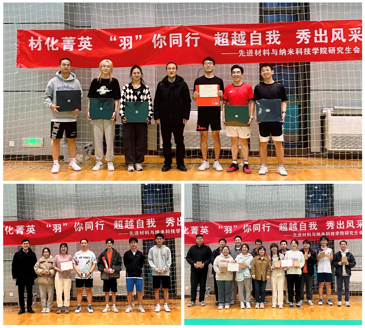 经过激烈的角逐,最终产生了本次比赛的冠军、亚军和季军,学院党委书记宋刚锋、党委副书记陈刚、研究生辅导员刘男三位老师分别为四支获奖队伍颁发了荣誉证书和奖品,向他们表示祝贺。在研究生会工作人员的辛苦工作、同学们的拼搏奋进中,羽毛球比赛落下帷幕。工作人员和参赛选手们合影留念,为这场精彩的比赛画上了圆满的句号。