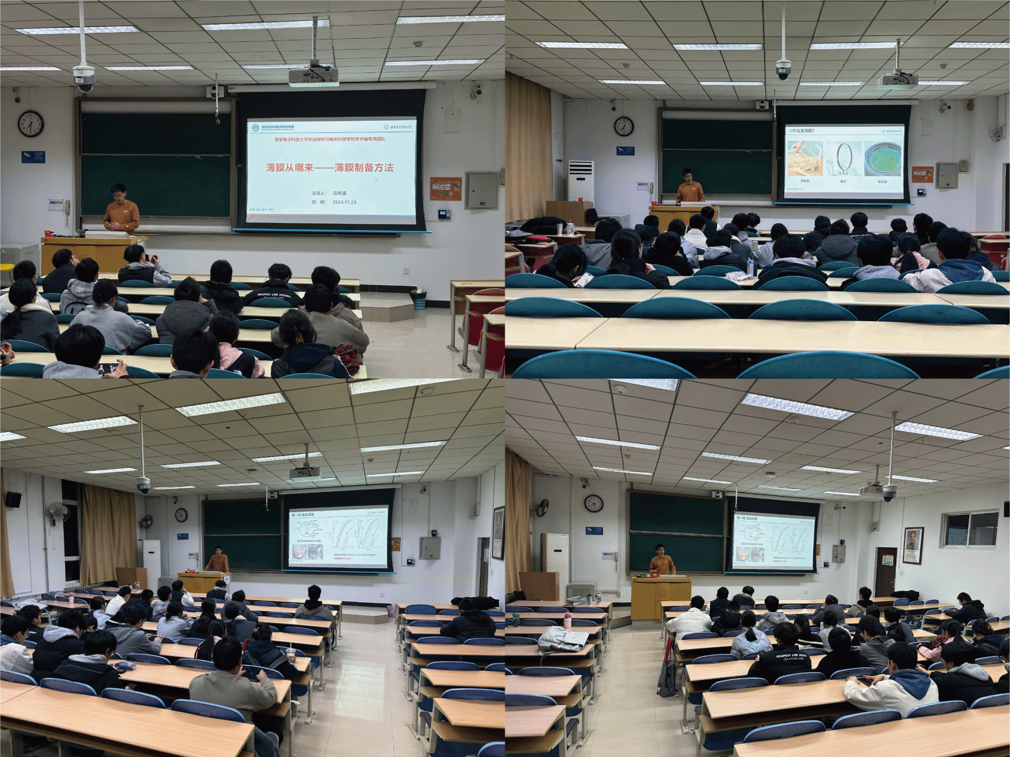此次活动特邀学院研究生学术辅导员、薄膜制备方向研究生马明盛担任主讲人。马明盛结合自己在薄膜制备方面的丰富经验,向在场本科生详细讲解了薄膜的概念及其应用,重点介绍了真空蒸发法的制备过程和相关技术要点,并分享了在实际研究中如何高效制备薄膜的方法。通过生动的讲解,帮助学生们更好地理解薄膜制备的关键技术,为今后的科研工作打下了坚实的基础。