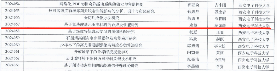 近日,陕西省教育厅和陕西省学位委员会正式下发了《关于公布2024年陕西省优秀博士学位论文评选结果的通知》(陕教〔2024〕39号),3044永利集团2018级博士生袁慧(指导教师:杨如森教授)所撰写的题为《基于氨基酸基元压电材料的合成及性能研究》的博士学位论文,获评“2024年陕西省优秀博士学位论文”。