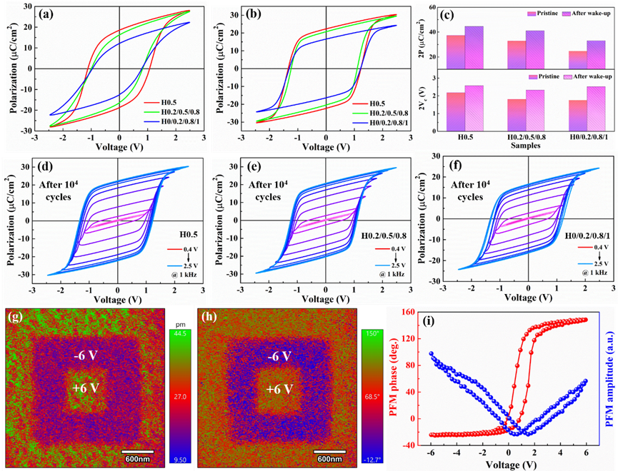 为了制备出Hf/Zr元素非均匀分布的Hf0.5Zr0.5O2铁电薄膜材料,研究团队首先进行图1(a)所示的结构设计,并分别利用原子层沉积技术和磁控溅射技术进行铁电薄膜材料和W金属电极制备。结合图1(b)-(o)的GIXRD图谱和TEM照片可以观察到薄膜内部铁电正交相的存在。进一步利用铁电分析仪和压电响应力显微镜(PFM)分别对制备的氧化铪基铁电薄膜的电滞回线和电翻转特征进行表征分析,如图2所示。无论对于唤醒前还是唤醒后的薄膜样品,均呈现出典型铁电体的电滞回线,并且没有观察到类反铁电体的双电滞回线特征,表明制备的薄膜样品含有大量的铁电正交相。当外加电压达到2V以后,剩余极化强度随测试电压增加而缓慢变化,表明在2V较低电压下便接近饱和状态。PFM相位和振幅图中明显的衬底对比反映向上和向下的极化状态,结合PFM滞后回线可以观察到接近180°的电转,表明制备的薄膜材料具有优异的铁电性。
