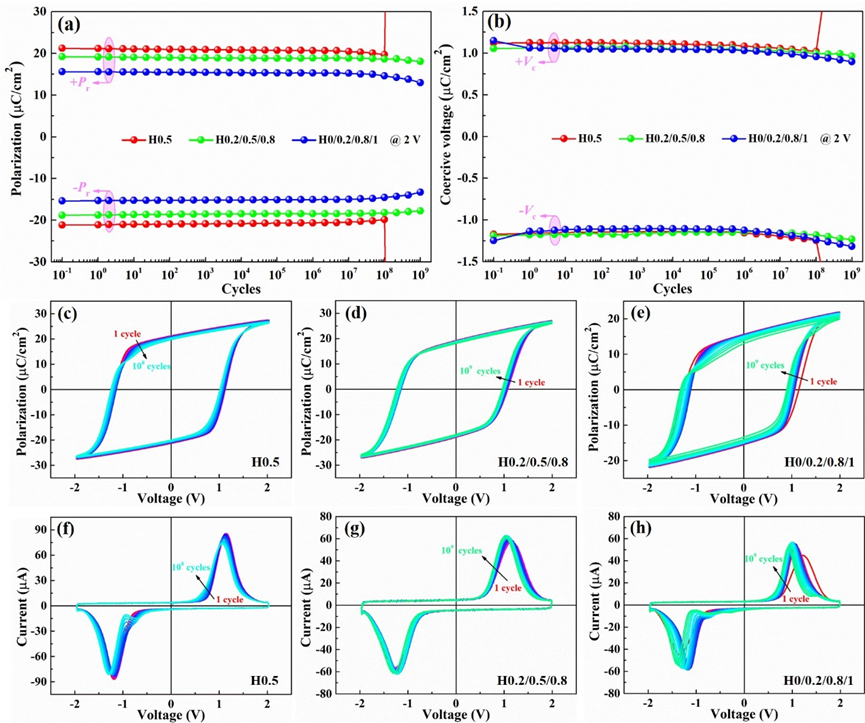 从图中可以观察到Hf/Zr元素非均匀分布有助于改善剩余极化强度的频率稳定性,尤其是H0.2/0.5/0.8样品不仅表现出较大的剩余极化强度和优异的稳定性,而且顽电压相较于其他样品得到降低。为了进一步探究不同Hf/Zr元素分布的Hf0.5Zr0.5O2薄膜电容器铁电性能的循环耐久性,测试得到剩余极化强度、顽电压、电滞回线和电流-电压曲线随循环次数变化特征,如图4所示。从图中可以观察到剩余极化强度随循环次数增加略有减低,尽管Hf/Zr元素均匀分布的H0.5样品呈现出最大的剩余极化强度值,但是在108次循环后便发生了击穿现象。相比之下,Hf/Zr元素非均匀分布的H0.2/0.5/0.8和H0/0.2/0.8/1样品的循环次数可以提升1个数量级以上,尤其是H0.2/0.5/0.8样品的2Pr在经过109次循环后依然可以达到36 μC/cm2,相当于疲劳前的94%。同时,顽电压的绝对值在109次循环测试过程中始终维持在0.96~1.24 V之间。