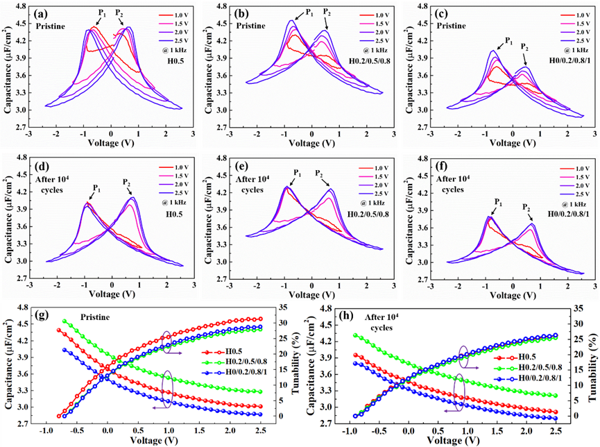 进一步地,对制备的不同Hf/Zr元素分布的Hf0.5Zr0.5O2薄膜电容器的电容-电压曲线进行了测试分析,如图5(a)-(f)所示。在唤醒前后,电容-电压曲线均呈现出典型的“蝶形”形状,表明制备的薄膜材料具有优异的铁电性能,这与测得的电滞回线结果一致。在唤醒之后,发现薄膜电容器的电容值有所降低,这可归因于高介电常数值的四方相在电场循环过程中转变为介电常数相对较低的铁电正交相,相应的电滞回线也变的更加饱满。鉴于高电调谐率和低驱动电压的铁电材料有望推动移相器、滤波器以及可调电容器等可调谐器件的小型化和集成化发展,进一步基于测得的电容-电压曲线计算得到相应的电调谐特性,如图5(g)-(g)所示。在2.5 V工作电压下,其电调谐率可以达到26%以上。