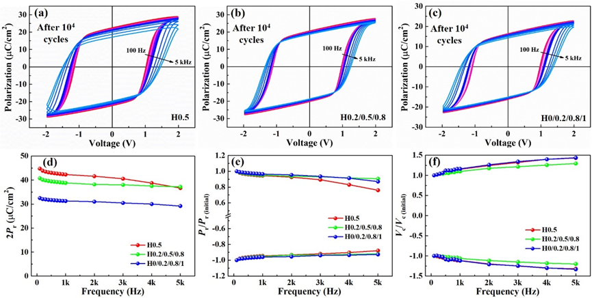 图3 不同Hf/Zr元素分布的Hf0.5Zr0.5O2薄膜电容器的电滞回线以及剩余极化强度和顽电压随频率变化曲线