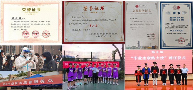在繁忙的学术和班级管理工作之余,刘智辉积极参与学校和学院组织的各种活动。他热爱篮球运动,多次参加院校篮球赛,并在学院毕业季篮球比赛中获得团体二等奖。篮球运动不仅锻炼了他的体魄,也培养了他的团队合作精神和竞争意识,使他在学习和工作中能够更加从容应对各种挑战。此外,刘智辉投身各项志愿者工作,在迎新志愿工作中,他热情接待新生和家长,帮助他们解决各种问题,使新生迅速适应新的学习和生活环境,以细致和耐心赢得了新生和家长们的一致好评;在学校运动会中,他做好各项后勤服务工作,被评为“优秀志愿者”。在闲暇时间,刘智辉还会前往北校区看望退休老教师,帮助他们做力所能及的家务活。目前,刘智辉担任我校校友联络使者,将为加强校友与母校之间的联系贡献自己的力量,他始终以实际行动践行着西电青年的责任与担当。