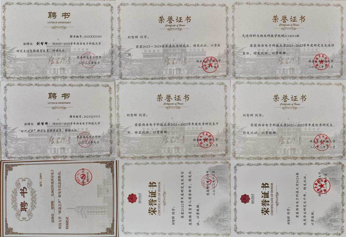 在班级管理工作中,刘智辉展现了优秀的领导力和组织能力。作为硕211401班班长,他始终以身作则、乐于助人,积极组织、协调开展班级事务,努力为同学们营造一个积极向上的班级氛围。其所在班级在2021-2022学年被评为“研究生先进班集体”,本人也荣获“优秀研究生”、“优秀研究生干部”荣誉称号。此外,他还担任应用化学系研究生党支部组织委员、学校信息联络员、“时代之声”研究生宣讲团成员等职务。在党支部工作中,他积极组织党员活动,加强党员之间的交流与合作,增强党组织的凝聚力;作为学校信息联络员,他负责收集和传递同学们反馈的信息,为学校的管理和决策提供了有力支持;作为研究生宣讲团成员,他向同学们介绍西电科学家故事,增强了大家对学校的认同感和归属感。